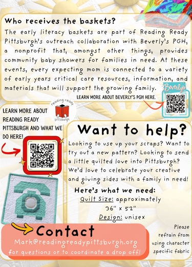 As you know, many tasks surround creating quits. You might sew, iron, cut, pin, layout, organize, longarm, bind or just cheer on your fellow quilters as we complete quilts for Reading Ready.