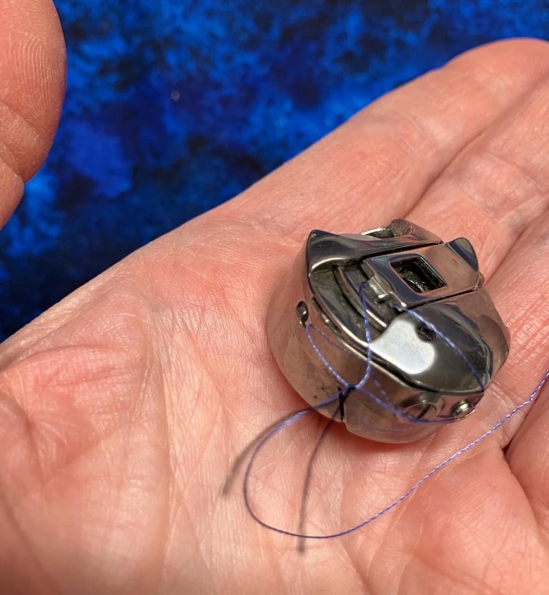 I've got a darker thread on the top, and in the picture you see a length knotted around the bobbin thread. It was cut at the top so I could even remove the bobbin.